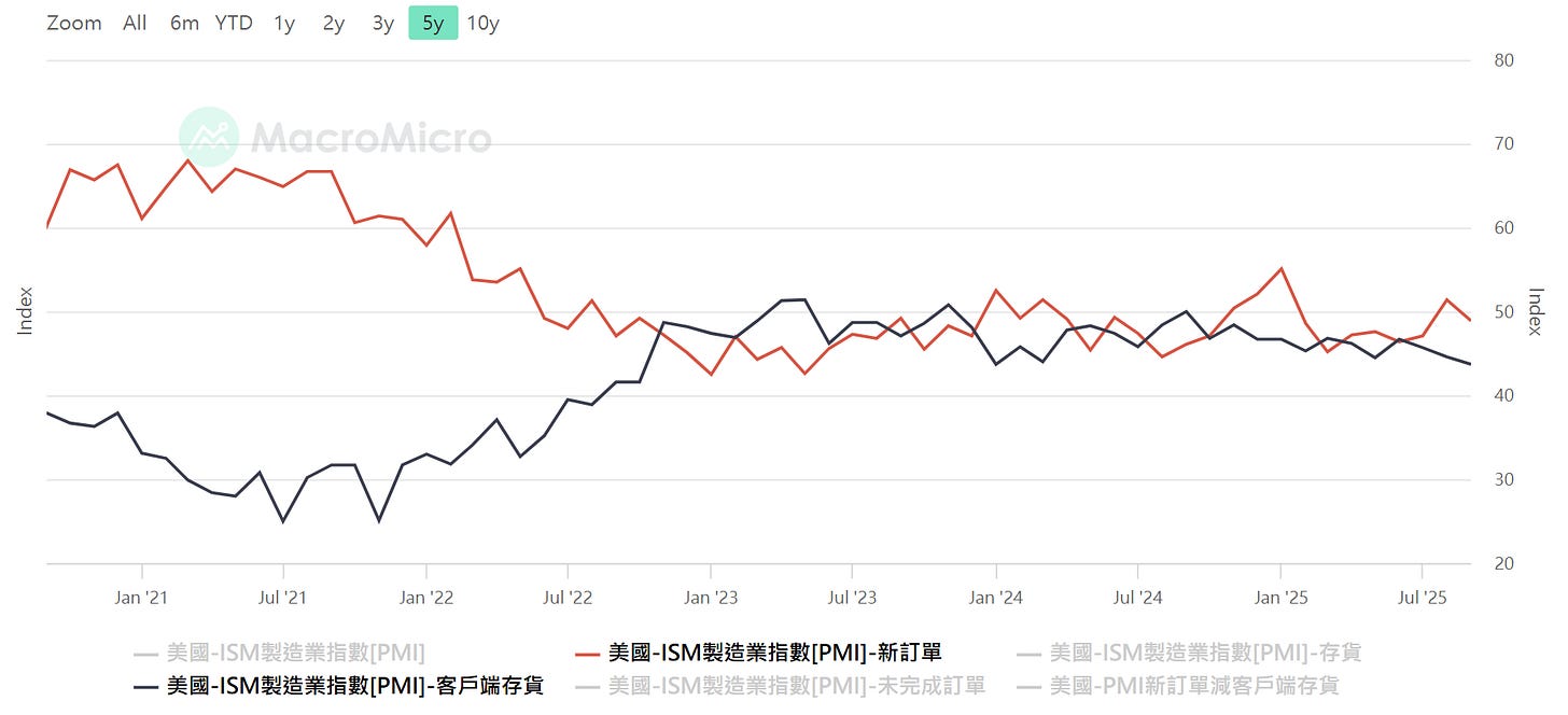 美國PMI新訂單,資料來源:MacroMicro 財經M平方,看「新訂單指數減客戶端庫存 (New Order - Customer’s inventory)」,透過這個相減指數,去抓客戶回補庫存的時機點,這才能跟上股市的 EPS 上修預期(參考美股韭菜王)。