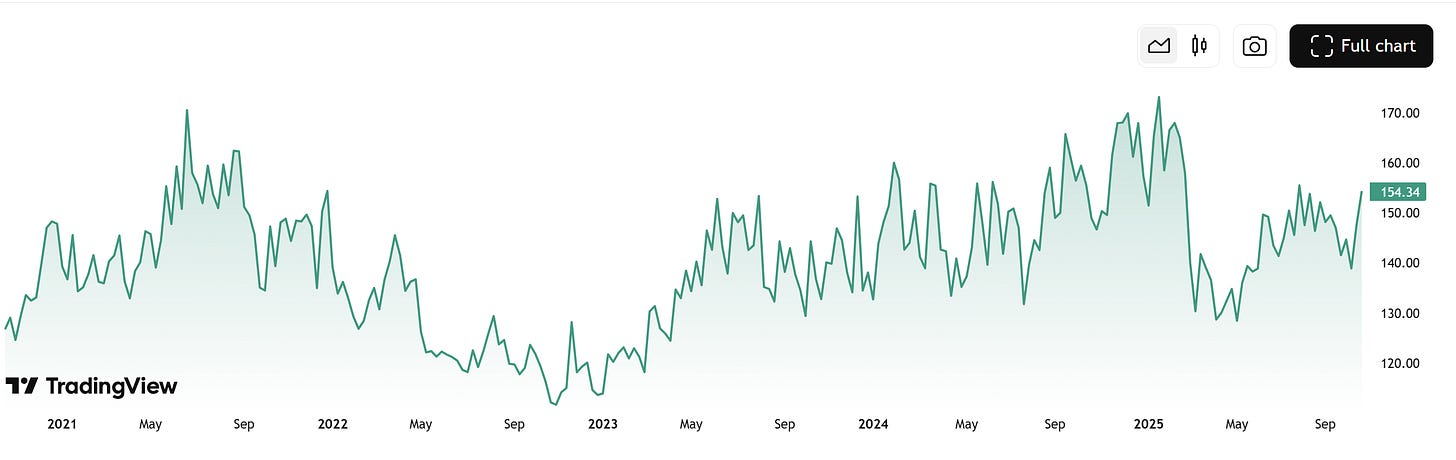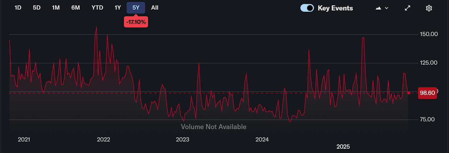 VVIX :如果 VIX 是「市場的恐懼」,那麼 VVIX 就是解讀為「市場對恐懼會增強的恐懼」,VVIX若在110-120,代表避險需求正在強化;若逼迫近150以上,市場已陷入「恐懼的波動」,資料來源 : yahoo finance