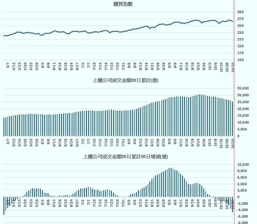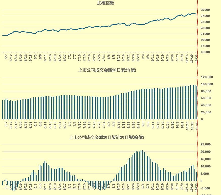 加權指數 vs 上市公司成交金額20日累計 vs 上市公司成交金額20日累計20日增減