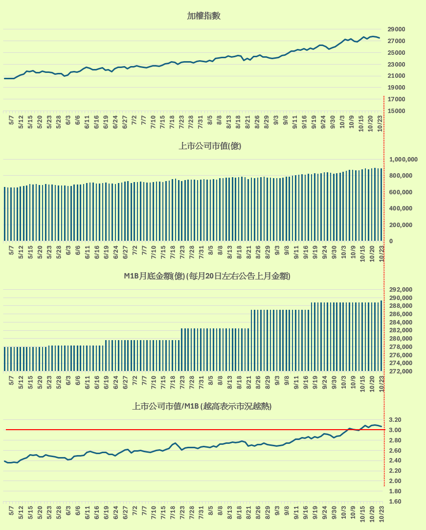 「上市公司市值 / M1B金額」 與加權指數的對應。(留意上市公司市值/M1B ,越高表示市況越熱),概念來源 : 總大。