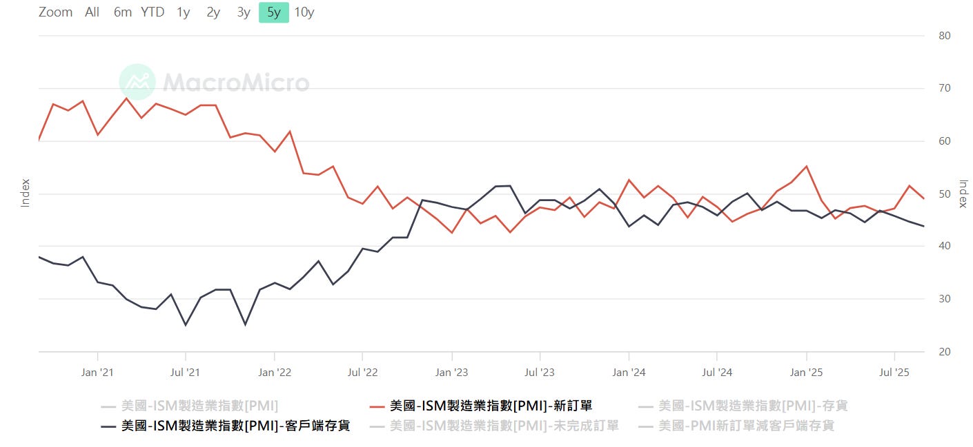 美國PMI新訂單,資料來源:MacroMicro 財經M平方,看「新訂單指數減客戶端庫存 (New Order - Customer’s inventory)」,透過這個相減指數,去抓客戶回補庫存的時機點,這才能跟上股市的 EPS 上修預期(參考美股韭菜王)。