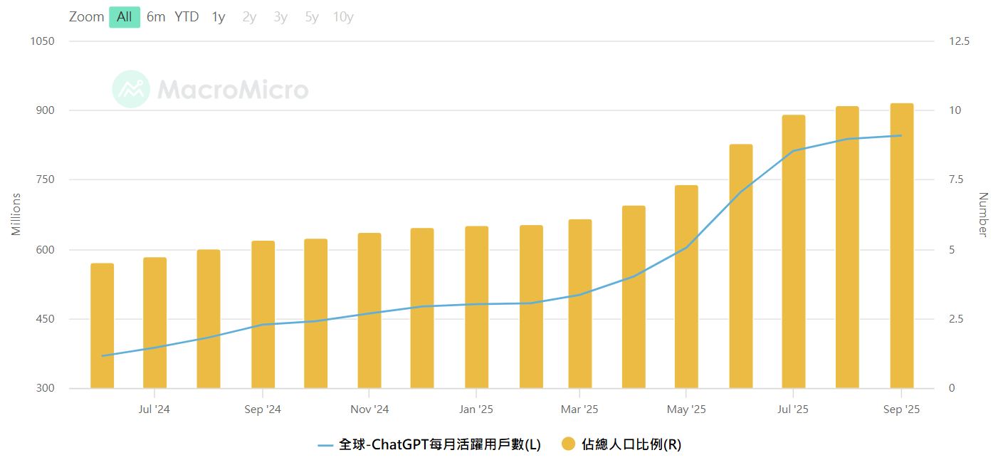 ChatGPT 每月活躍用戶數及佔比,資料來源 : MacroMicro 財經M平方