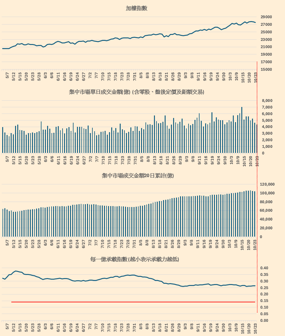 集中市場成交金額跟加權指數的對應。(留意每一億承載指數,越小表示承載力越低),概念來源 : 總大。
