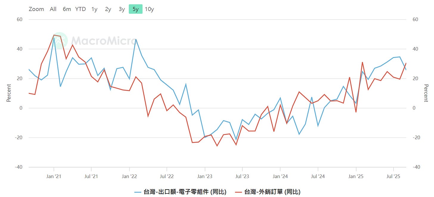 台灣-電子零組件出口(年增率) ,台灣-外銷訂單(年增率)注意高低點極值(-10~+20),資料來源:MacroMicro 財經M平方,SimonShih,財經雷說明