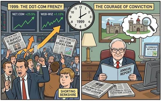 1999年,是網際網路泡沫崩潰的前夕,如果當時手裡沒有半張科技股,你簡直像是個外星人,那些網路公司的股票翻倍再翻倍地漲,但巴菲特從兩年前就開始減少部位,結果就是波克夏的股價表現完全跟不上大盤,當時各大主流媒體都在冷嘲熱諷,甚至有人直接做空波克夏,認定這老頭已經跟不上時代了。
