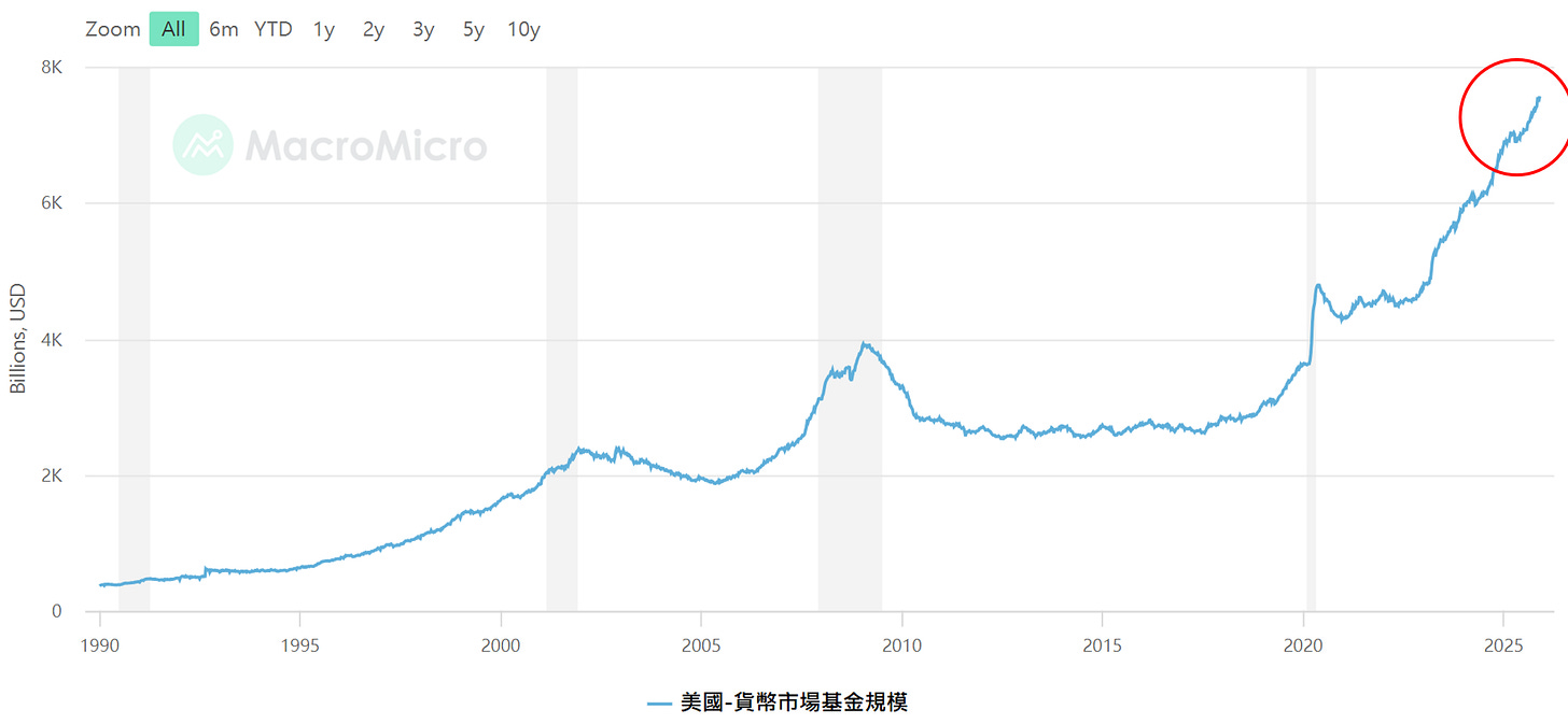 但目前貨幣市場基金規模超過7兆美元創下歷史新高,但其中有很大比例是企業、金融機構等機構投資者的現金管理部位。機構資金停泊在貨幣市場基金,不是因為恐慌,而是因為貨幣市場基金 的報酬率(約5%左右)遠高於銀行存款,把它當作一個資產在配置,這類資金穩定性高,不會因為央行啟動微幅降息就立刻湧入股市,他們需要更明確的經濟復甦信號才會行動。