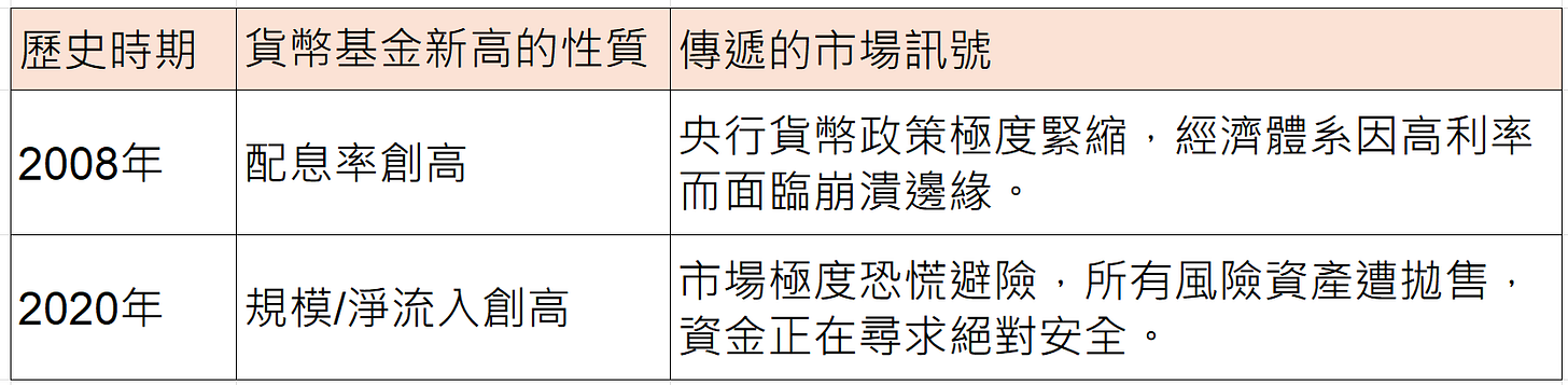 -結論:高配息率使貨幣市場基金成為股市資金逃難的「安全港」,資金大量撤離股市本身就是股市崩盤的前兆(前兆≠崩盤)。