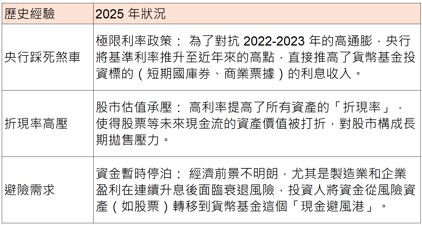 當短期利率極高時,市場資金會出現結構性的變化,「無風險」套利吸引力大增,當貨幣市場基金配息率高到一個水平(例如高於5%),甚至能與股票市場的預期報酬相媲美時,就會產生巨大的吸引力。