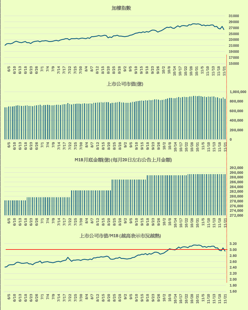 「上市公司市值 / M1B金額」 與加權指數的對應。(留意上市公司市值/M1B ,越高表示市況越熱),概念來源 : 總大。