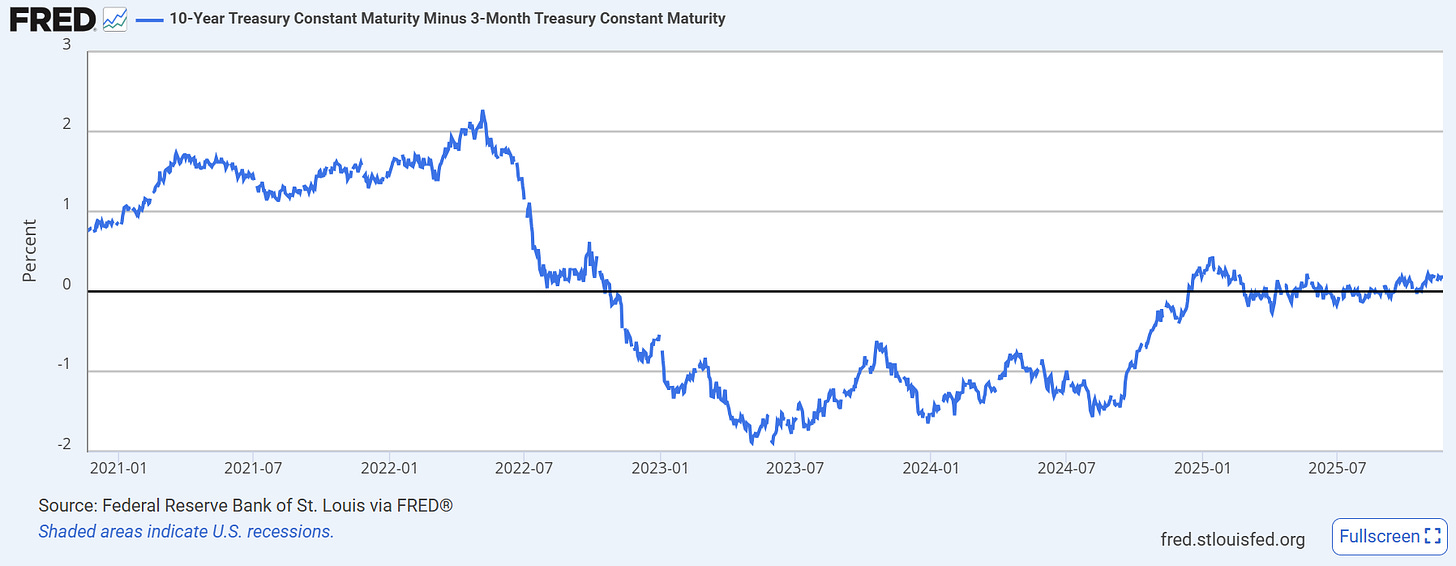 美10年債殖利率-3個月殖利率,資料來源:Fred