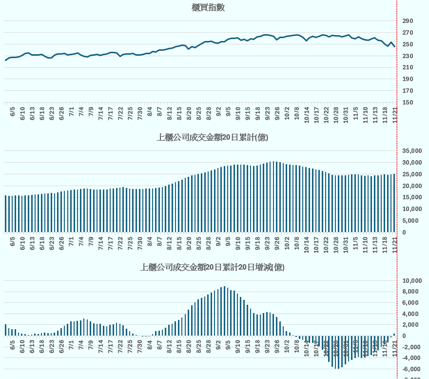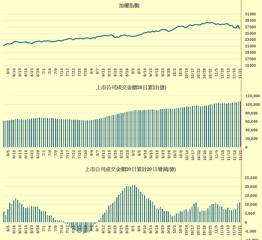 加權指數 vs 上市公司成交金額20日累計 vs 上市公司成交金額20日累計20日增減