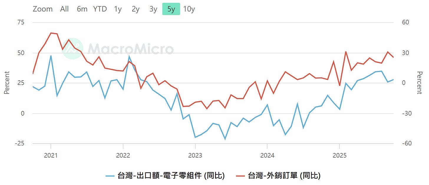 台灣-電子零組件出口(年增率) ,台灣-外銷訂單(年增率)注意高低點極值(-10~+20),資料來源:MacroMicro 財經M平方,SimonShih,財經雷說明