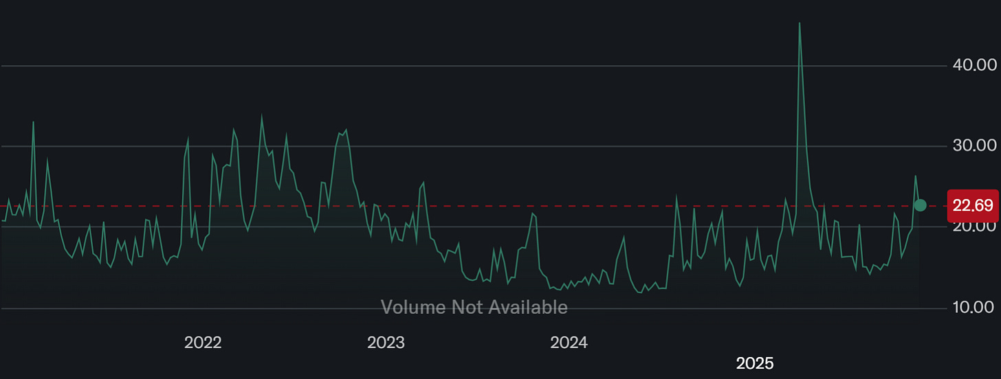 VIX :期權市場對未來 30 天標普 500 波動率預期,VIX長期平均約在19左右。若低於15,代表市場平靜;超過25,開始進入不安;若衝破30或40,多半是危機時刻,但它只能告訴你市場「表面的恐懼」,資料來源 : yahoo finance
