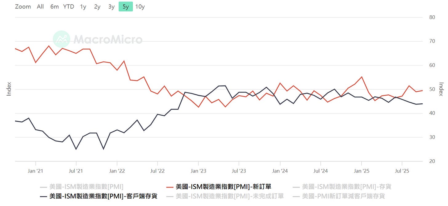 美國PMI新訂單,資料來源:MacroMicro 財經M平方,看「新訂單指數減客戶端庫存 (New Order - Customer’s inventory)」,透過這個相減指數,去抓客戶回補庫存的時機點,這才能跟上股市的 EPS 上修預期(參考美股韭菜王)。