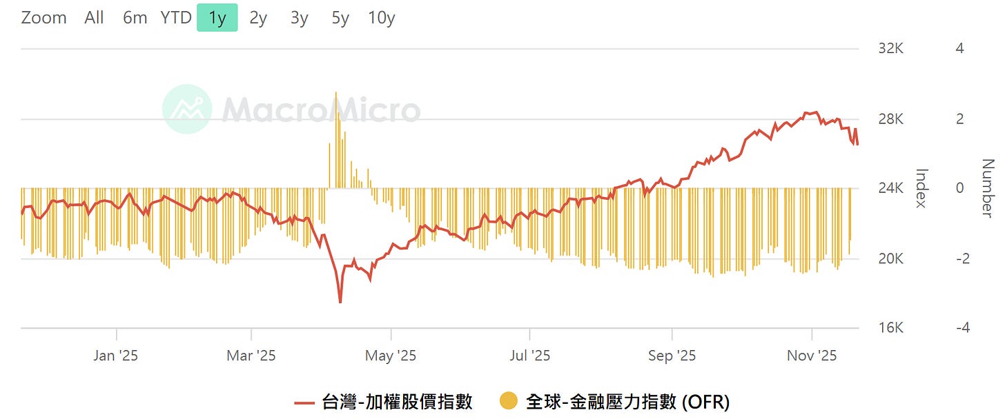 全球金融壓力指數vs加權,資料來源:MacroMicro 財經M平方,留意壓力指數從低點開始往上攀升