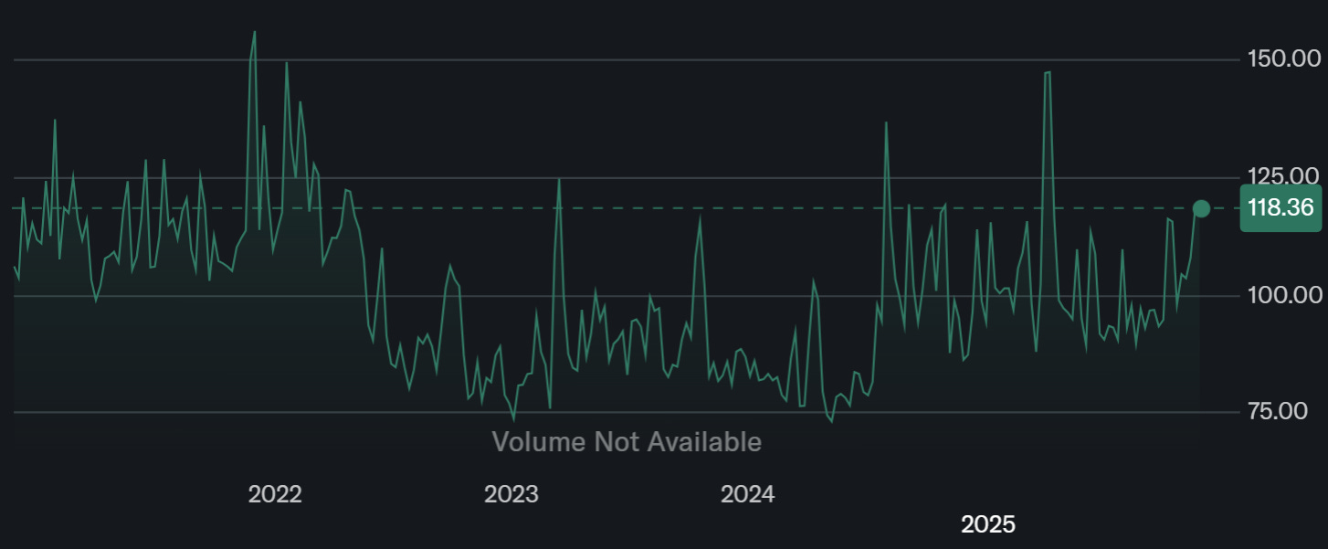 VVIX :如果 VIX 是「市場的恐懼」,那麼 VVIX 就是解讀為「市場對恐懼會增強的恐懼」,VVIX若在110-120,代表避險需求正在強化;若逼迫近150以上,市場已陷入「恐懼的波動」,資料來源 : yahoo finance