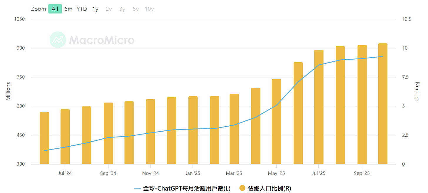 ChatGPT 每月活躍用戶數及佔比,資料來源 : MacroMicro 財經M平方