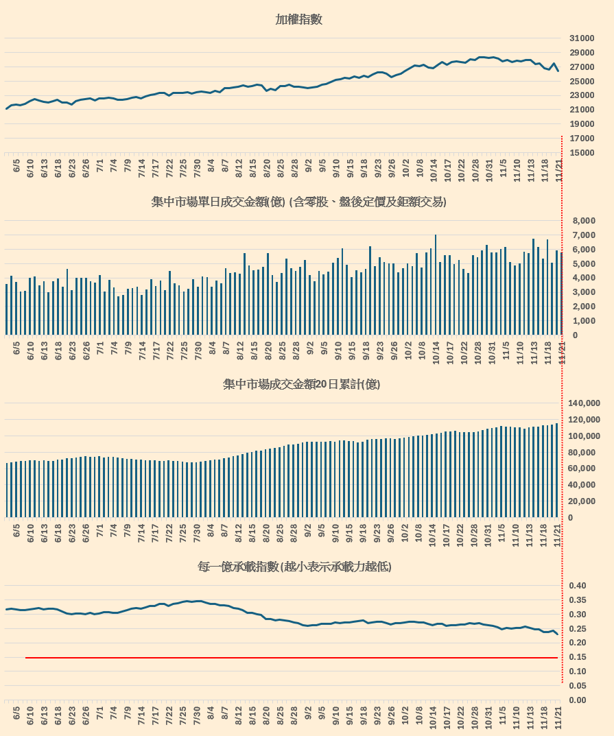 集中市場成交金額跟加權指數的對應。(留意每一億承載指數,越小表示承載力越低),概念來源 : 總大。