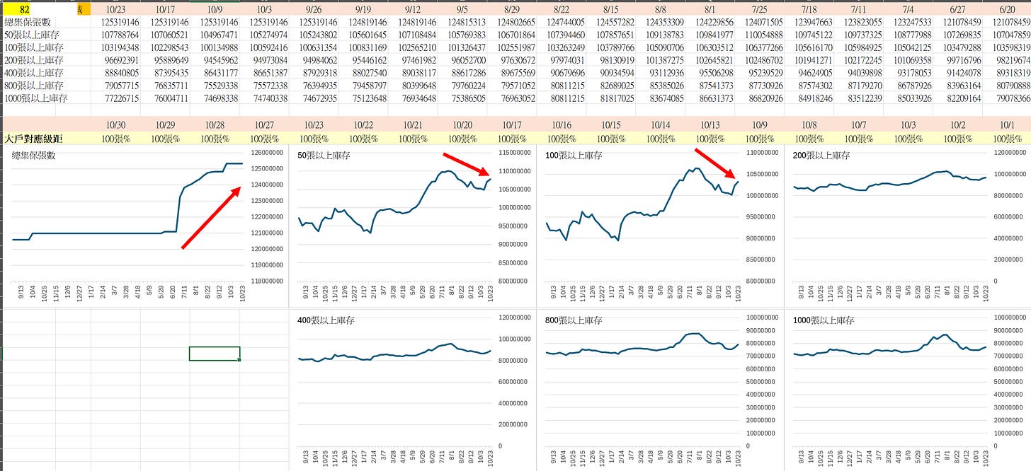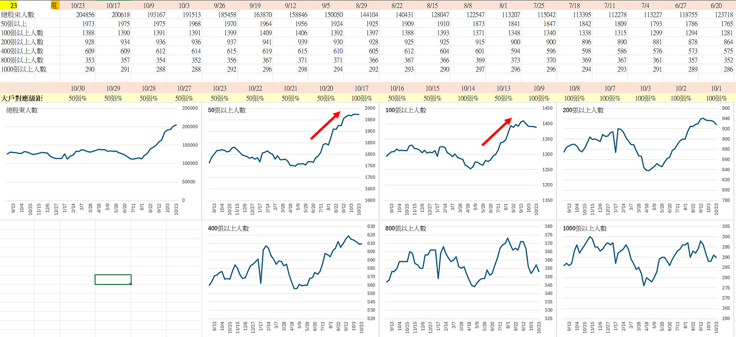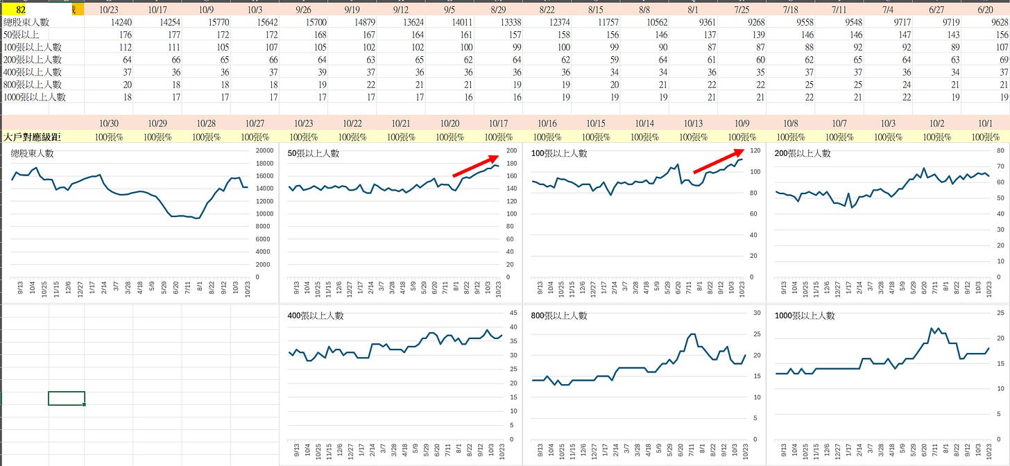 但如果看50–100張區間的股東人數,反而是從 7 月以來持續增加。
