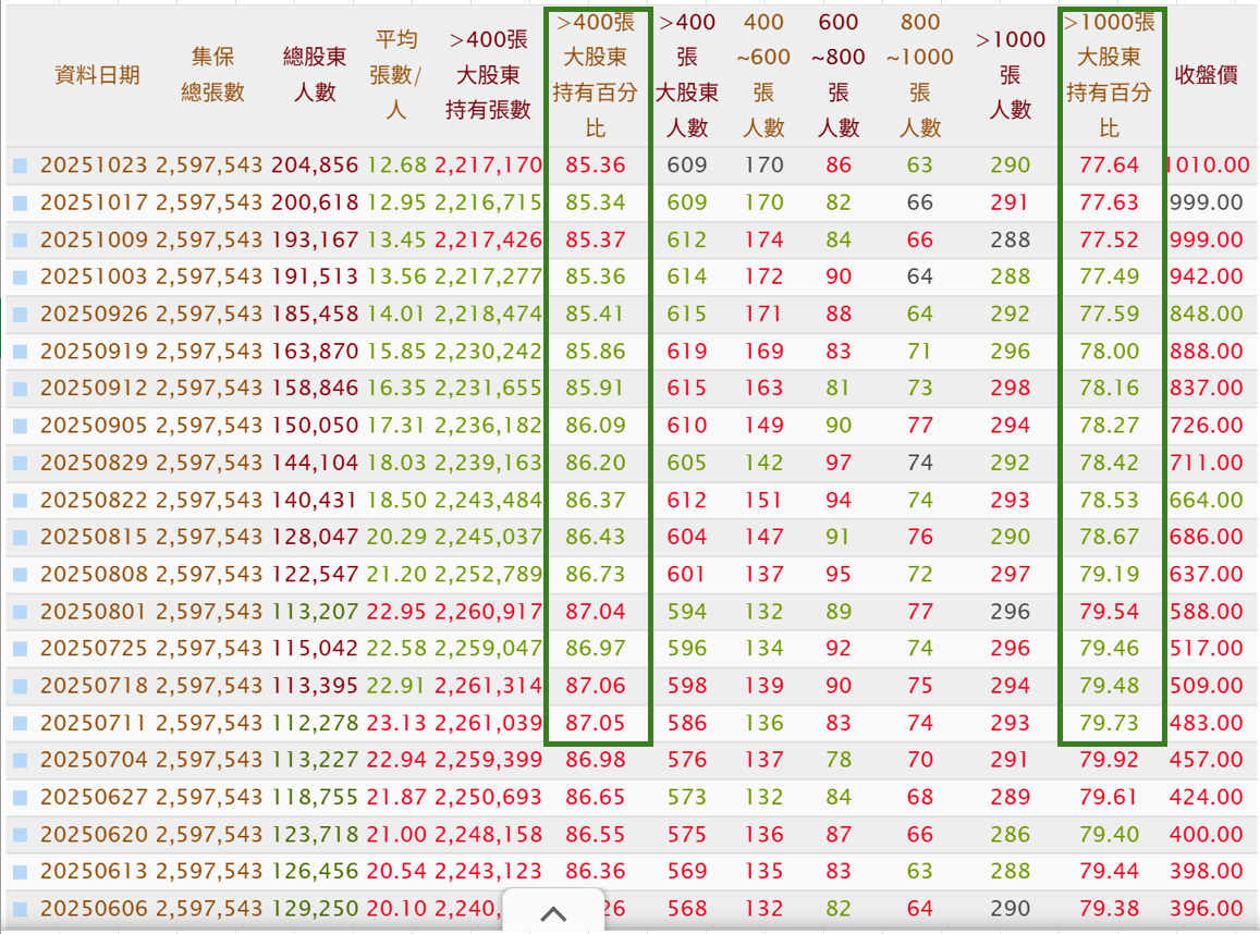 由於比例計算仍以「張數」為基礎,因此在股價上漲後,「大戶比例」看起來下降了。