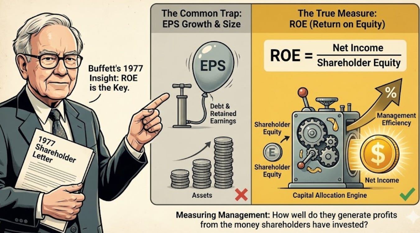 巴菲特提出了現在大家耳熟能詳的觀點:衡量管理層表現的合理指標是ROE(股東權益報酬率),而非每股盈餘(EPS)的增長。