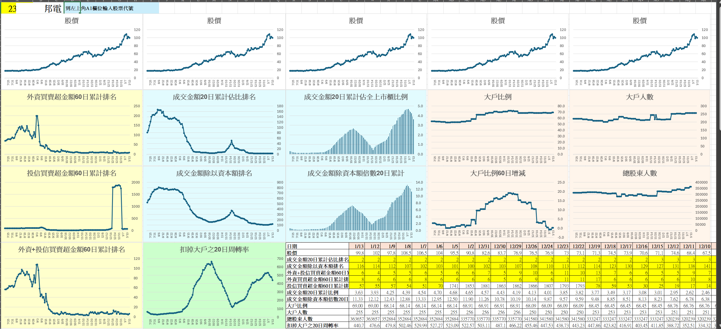 1. 大戶比例與大戶人數 : 我不再單純地將400張%或1000張%視為大戶,而是納入股價因子,將「持股市值5000萬」當作大戶的基準,有了基準就可以追蹤大戶比例跟人數的變化。