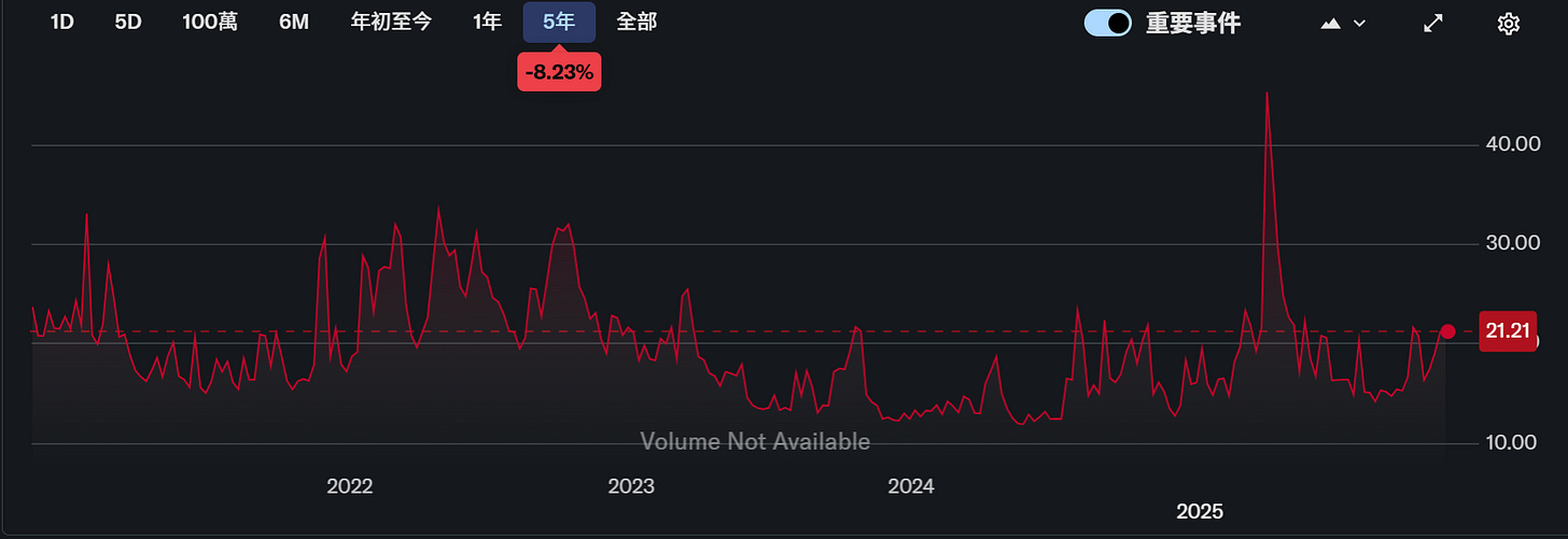 VIX :期權市場對未來 30 天標普 500 波動率預期,VIX長期平均約在19左右。若低於15,代表市場平靜;超過25,開始進入不安;若衝破30或40,多半是危機時刻,但它只能告訴你市場「表面的恐懼」,資料來源 : yahoo finance