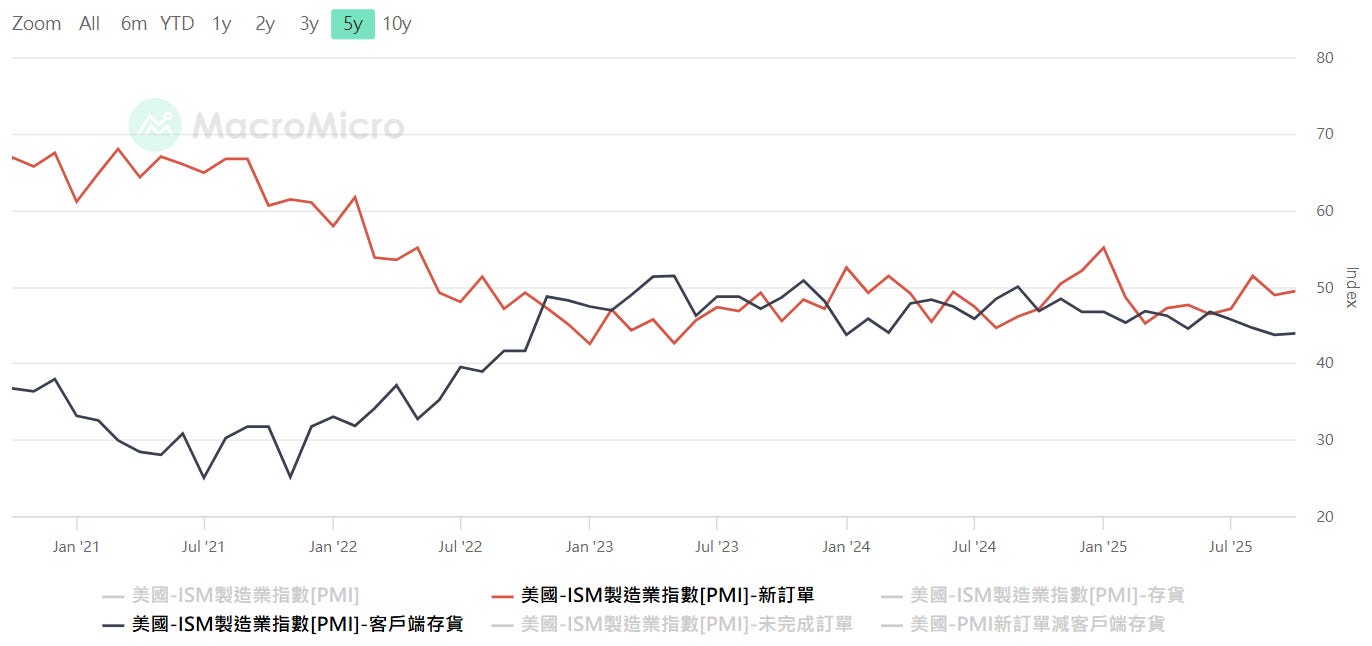 美國PMI新訂單,資料來源:MacroMicro 財經M平方,看「新訂單指數減客戶端庫存 (New Order - Customer’s inventory)」,透過這個相減指數,去抓客戶回補庫存的時機點,這才能跟上股市的 EPS 上修預期(參考美股韭菜王)。