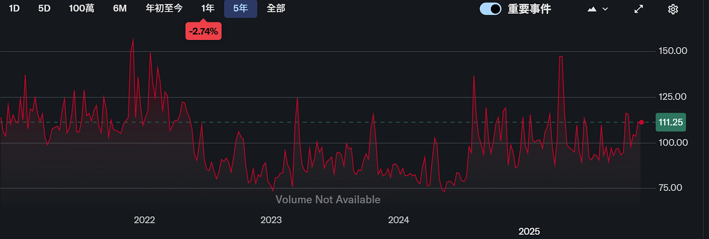 VVIX :如果 VIX 是「市場的恐懼」,那麼 VVIX 就是解讀為「市場對恐懼會增強的恐懼」,VVIX若在110-120,代表避險需求正在強化;若逼迫近150以上,市場已陷入「恐懼的波動」,資料來源 : yahoo finance