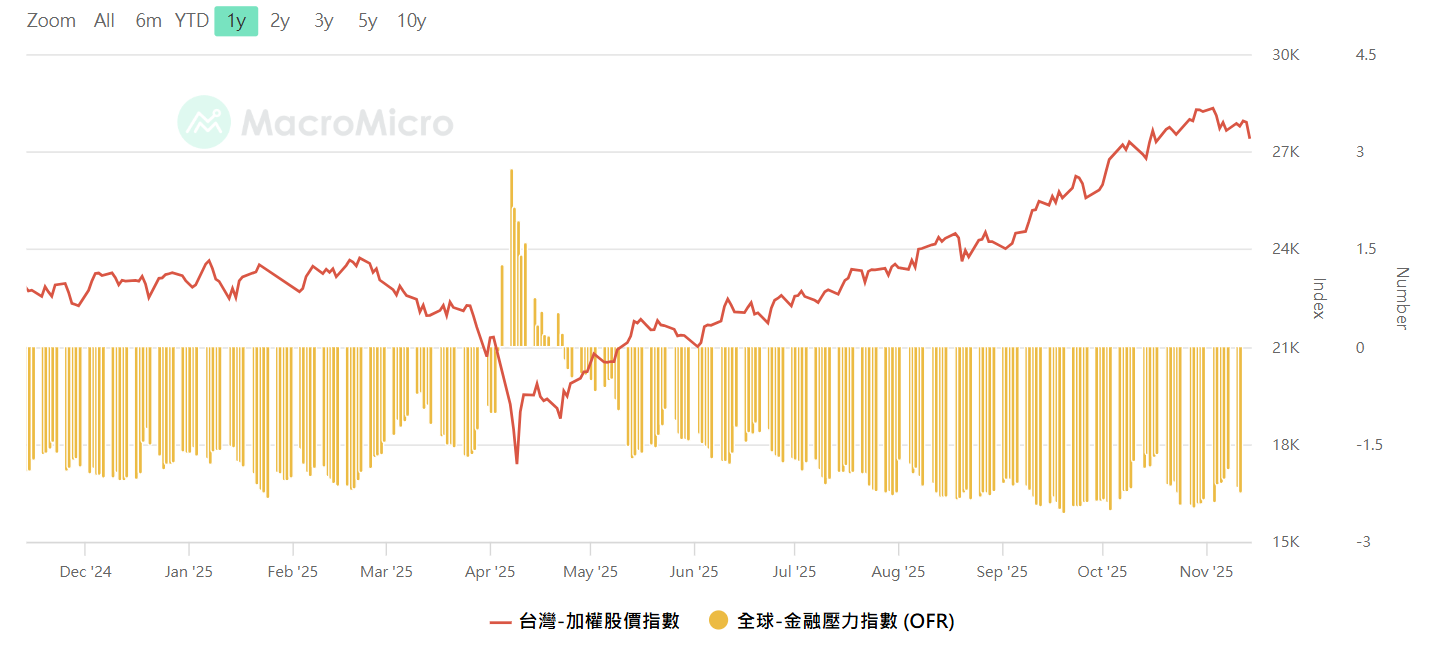 全球金融壓力指數vs加權,資料來源:MacroMicro 財經M平方,留意壓力指數從低點開始往上攀升