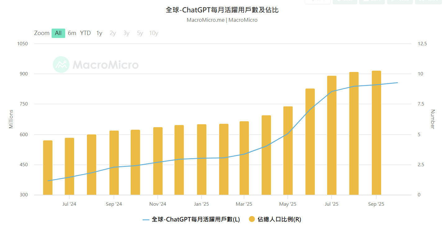 ChatGPT 每月活躍用戶數及佔比,資料來源 : MacroMicro 財經M平方