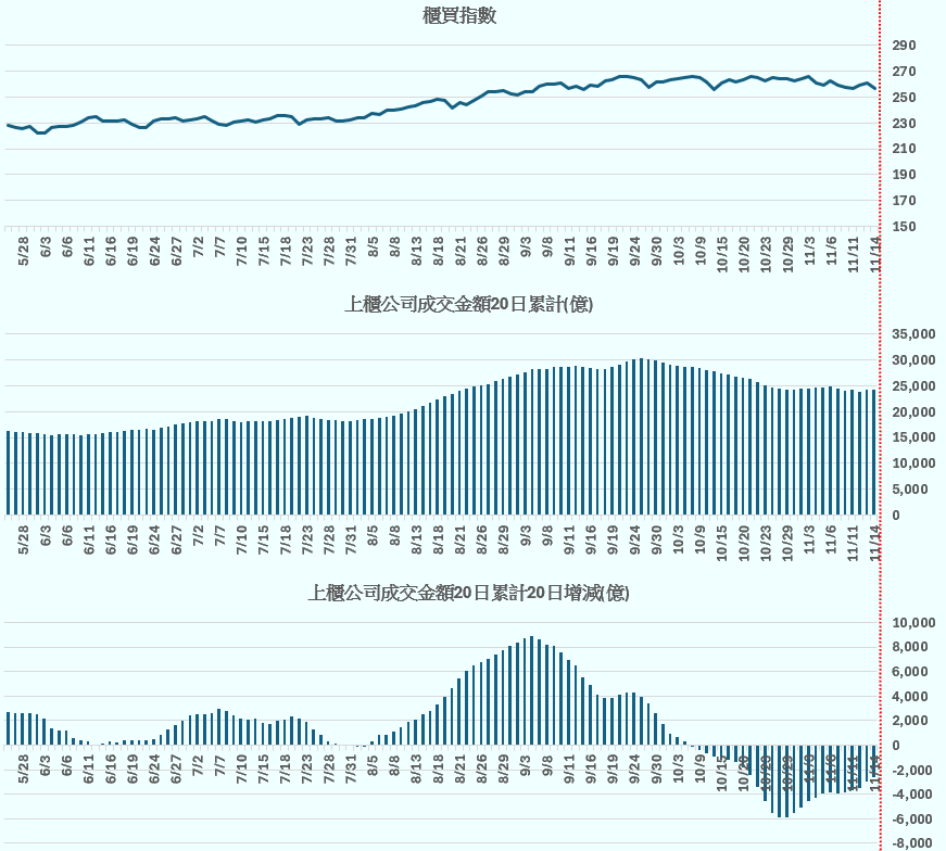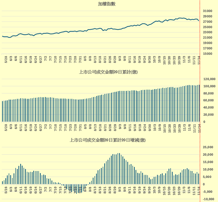 加權指數 vs 上市公司成交金額20日累計 vs 上市公司成交金額20日累計20日增減