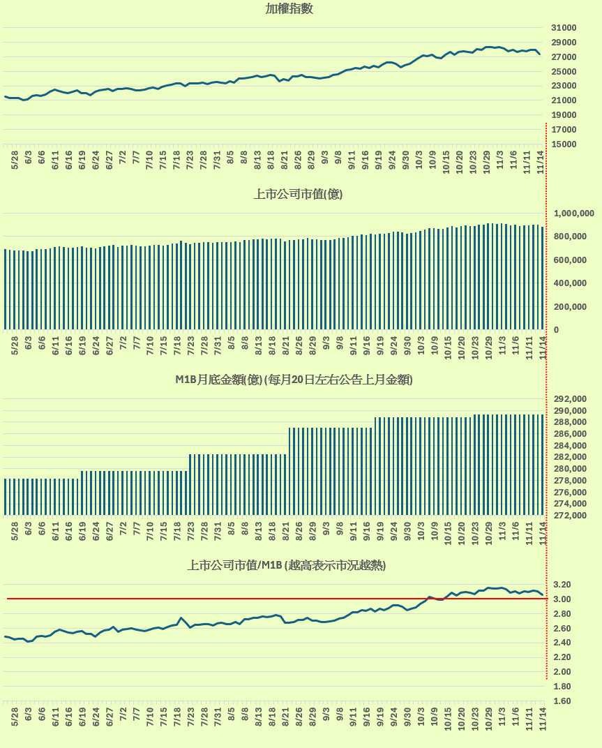 「上市公司市值 / M1B金額」 與加權指數的對應。(留意上市公司市值/M1B ,越高表示市況越熱),概念來源 : 總大。