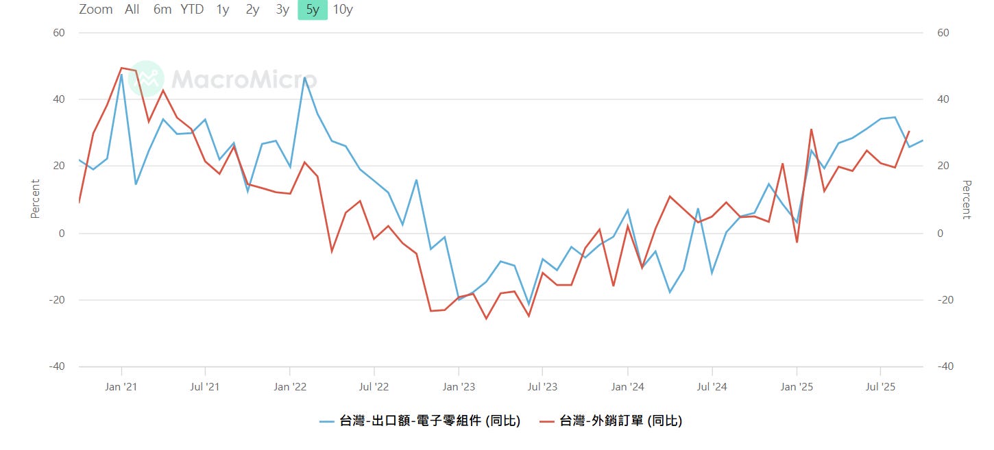 台灣-電子零組件出口(年增率) ,台灣-外銷訂單(年增率)注意高低點極值(-10~+20),資料來源:MacroMicro 財經M平方,SimonShih,財經雷說明