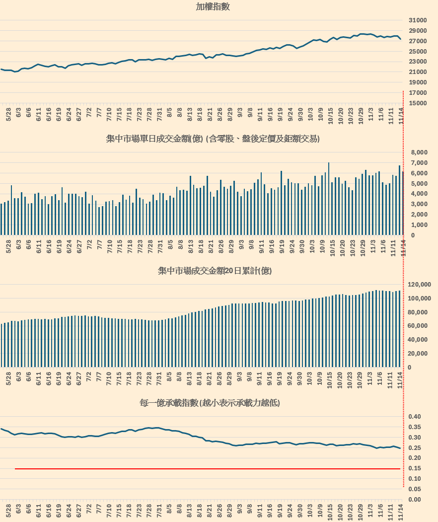 集中市場成交金額跟加權指數的對應。(留意每一億承載指數,越小表示承載力越低),概念來源 : 總大。