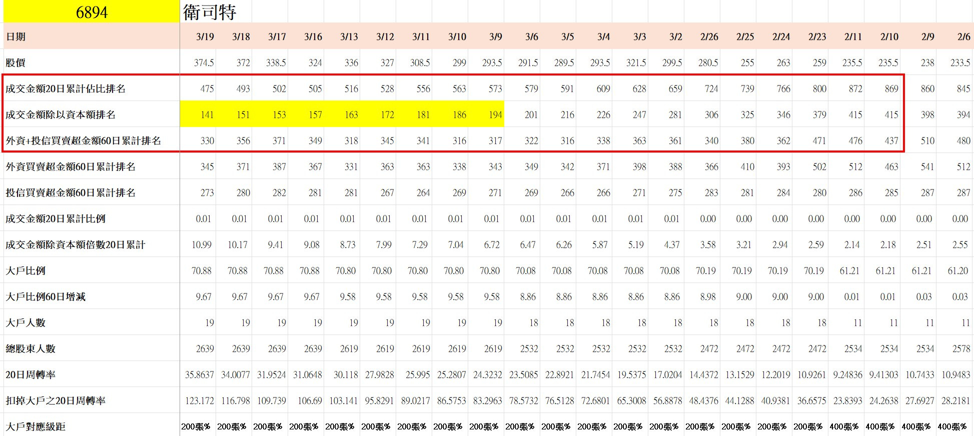 在我的定義裡,大戶的級距是依據市值來變動的,因為衛司特的股價持續上漲,我的「大戶門檻」(市值 5000 萬),已經從原本的400張調整到了200張。
