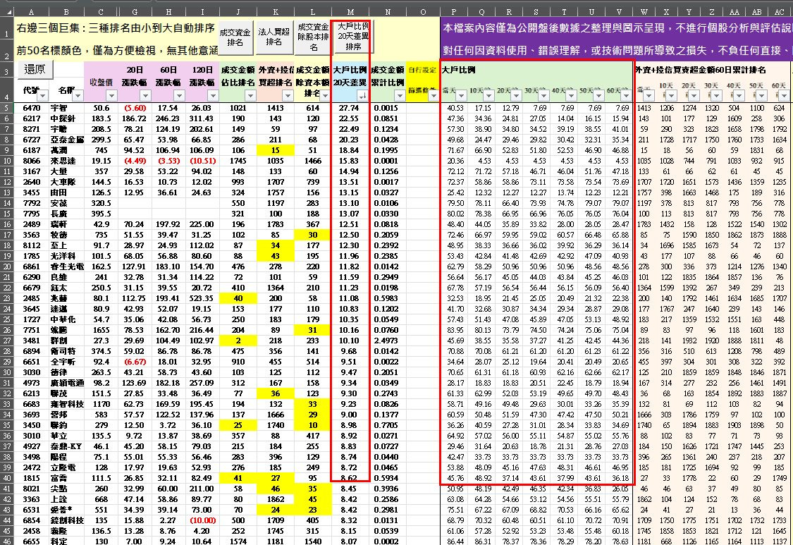 但這也讓我多了一個靈感,要新增「大戶比例」的排序功能,原本檔案中的「全上市櫃檢視表」頁面只有排名數據,沒有大戶比例數據,但看來有必要拉進來。