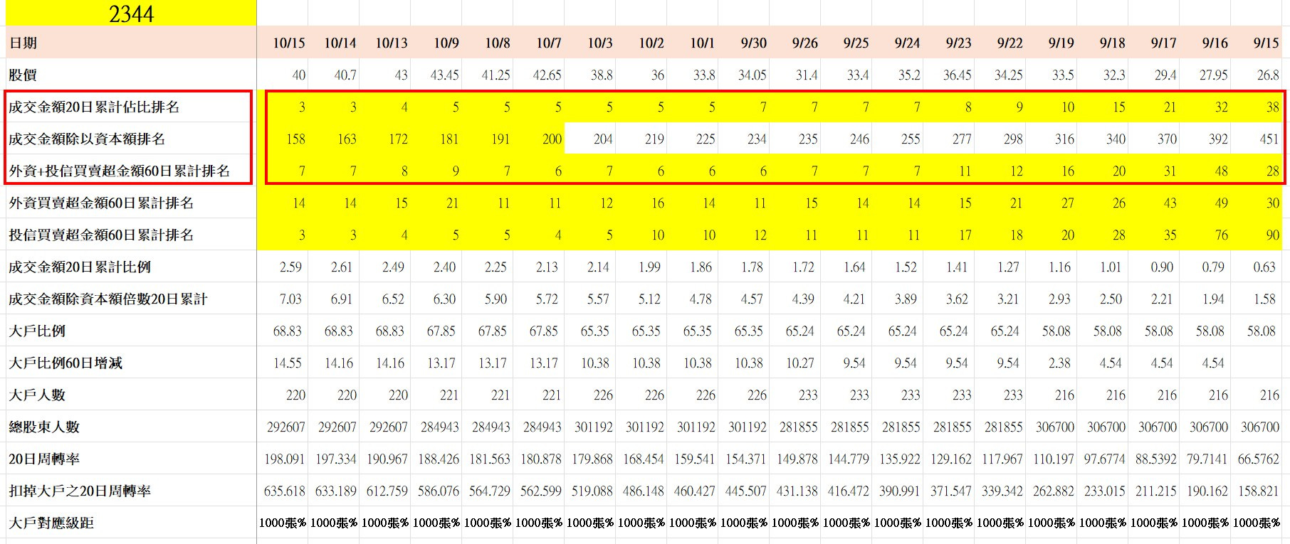 但如果你去看華邦電,去年9月華邦電的成交量能一直在前50名,甚至一度衝進前5名。法人的買超排名雖然偶有波動,但也幾乎沒掉出過前50名之外。
