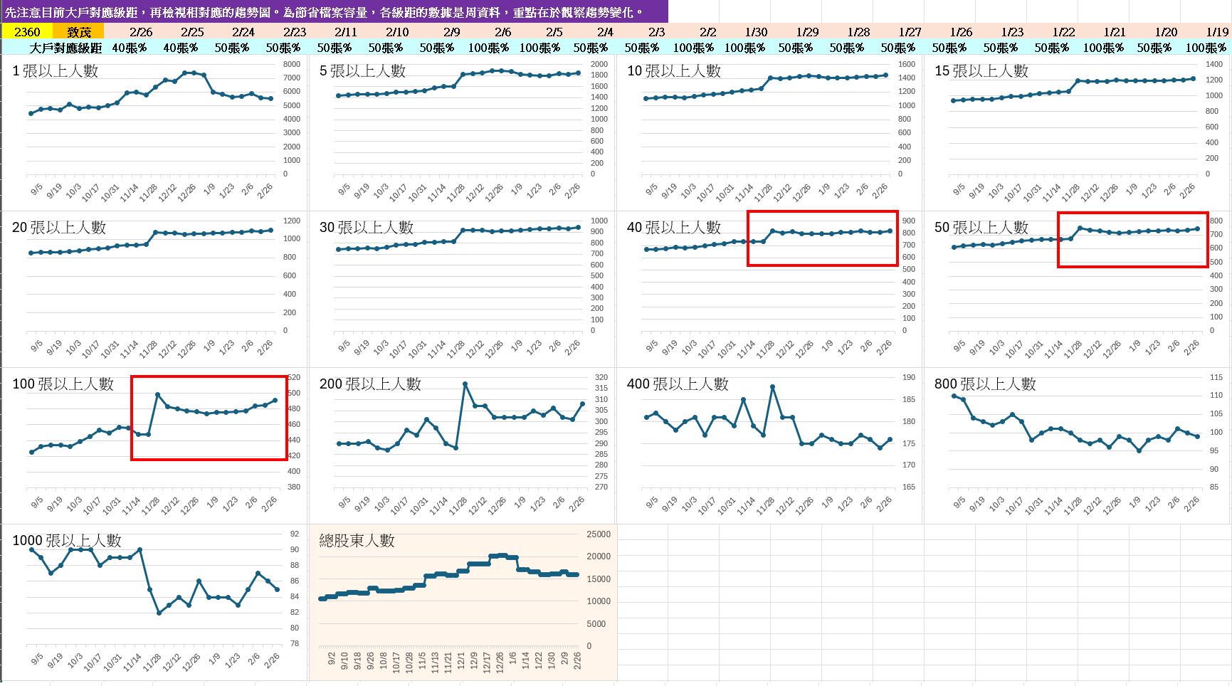 我在一頁檢視表新增了一個Sheet,名稱就叫「股東人數圖」。訂閱戶在檢視個股的價量籌碼變化時,只要點一下分頁,就可以同步看到每個持股張數的人數變化。我特別設計了連動機制,讓大家可以一眼看到該個股目前對應的「大戶對應級距」。