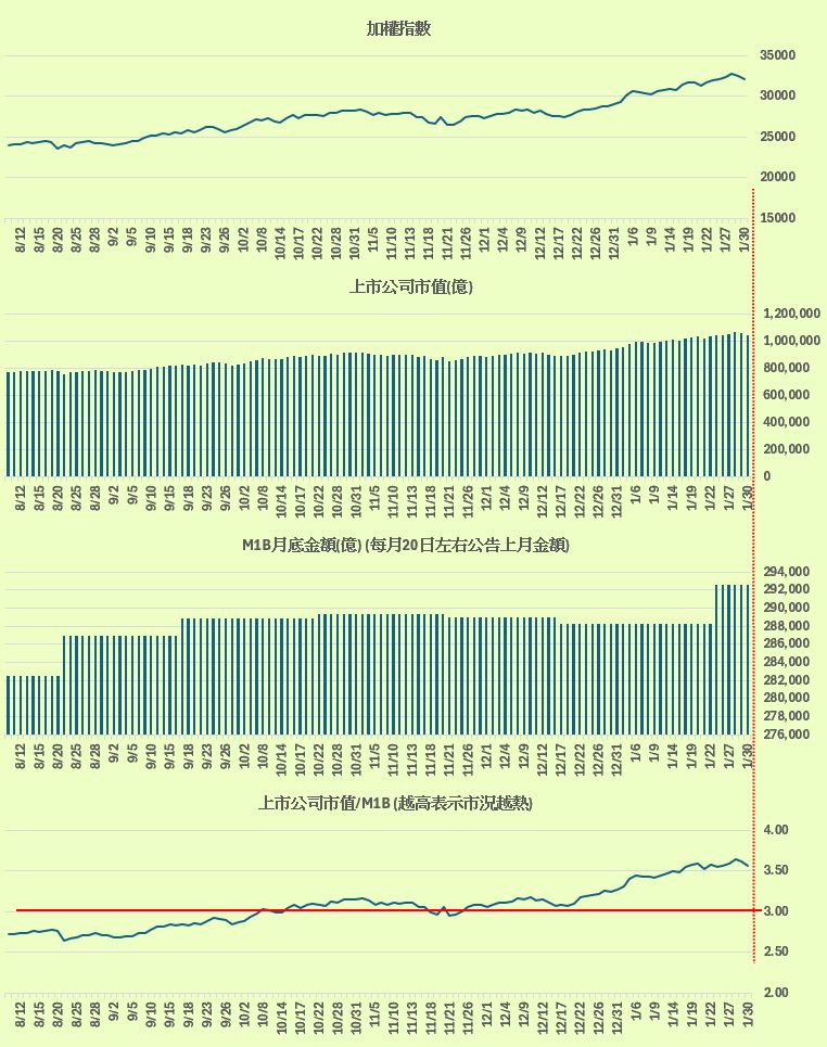 「上市公司市值 / M1B金額」 與加權指數的對應。(留意上市公司市值/M1B ,越高表示市況越熱),概念來源 : 總大。