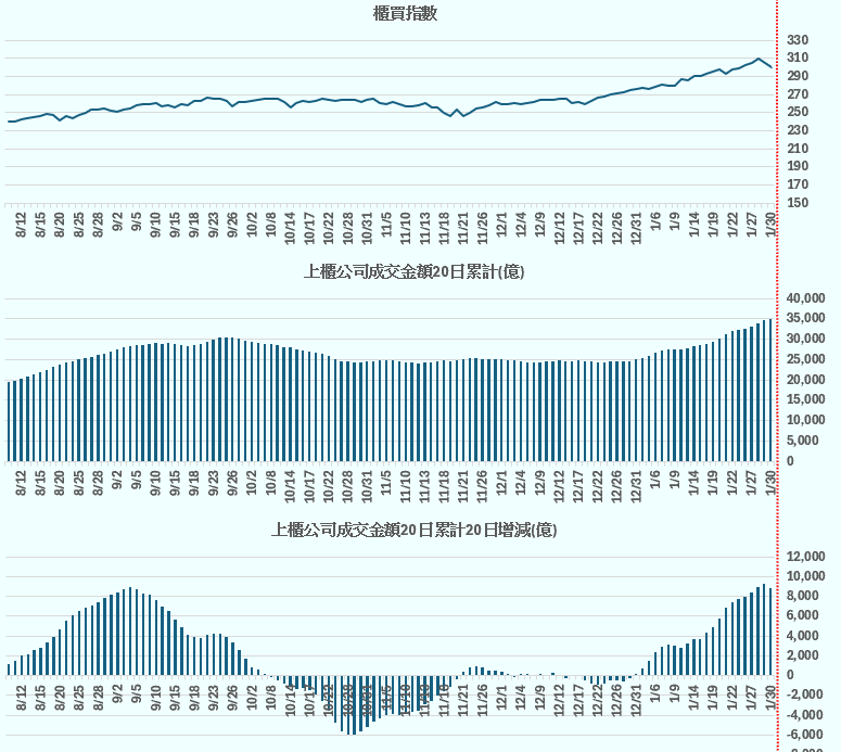 櫃買指數 vs 上櫃公司成交金額20日累計(億)