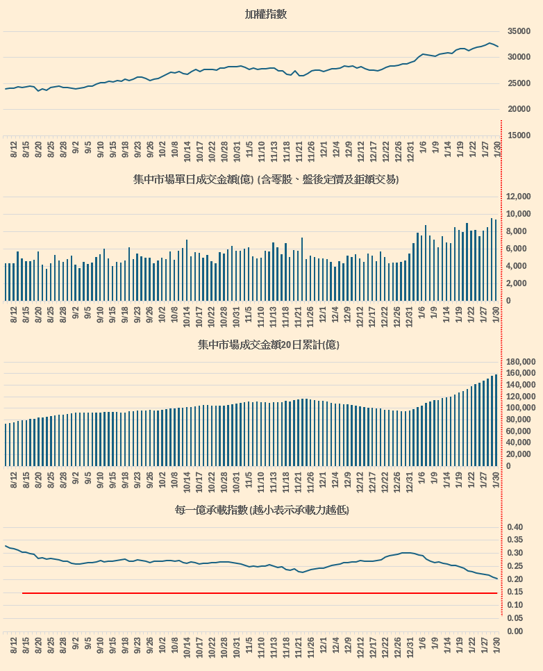 集中市場成交金額跟加權指數的對應。(留意每一億承載指數,越小表示承載力越低),概念來源 : 總大。