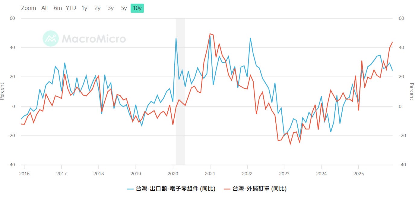 台灣-電子零組件出口(年增率) ,台灣-外銷訂單(年增率)注意高低點極值(-10~+20),資料來源:MacroMicro 財經M平方,SimonShih,財經雷說明