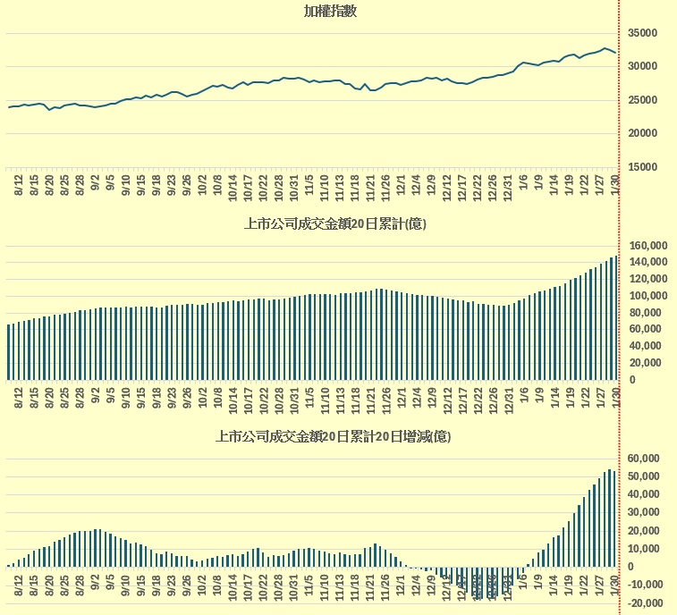 加權指數 vs 上市公司成交金額20日累計(億)