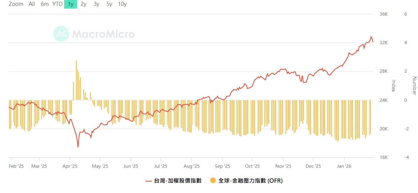 全球金融壓力指數vs加權,資料來源:MacroMicro 財經M平方,留意壓力指數從低點開始往上攀升