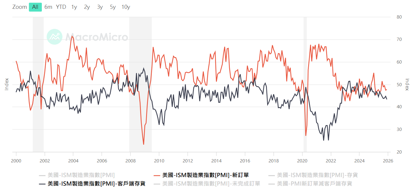 美國PMI新訂單,資料來源:MacroMicro 財經M平方,看「新訂單指數減客戶端庫存 (New Order - Customer’s inventory)」,透過這個相減指數,去抓客戶回補庫存的時機點,這才能跟上股市的 EPS 上修預期(參考美股韭菜王)。