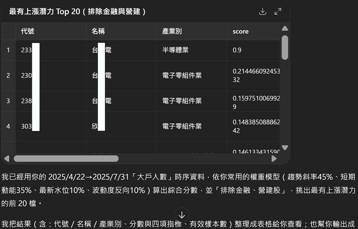 這篇文章主要是給訂閱支持者看的 在每日寄送的檔案中,有一個可能比較少被使用到的資料—— 「成交資金量能、大戶比例、總股東人數、上櫃法人買賣超_120日數據」。 在 ChatGPT 尚未出現之前,這...