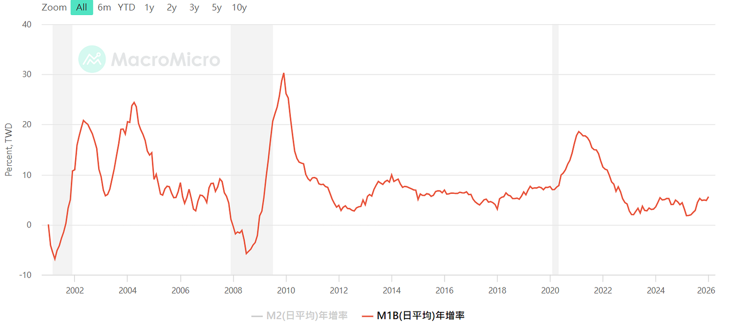 M1B年增率,若負值為警訊,資料來源:MacroMicro 財經M平方