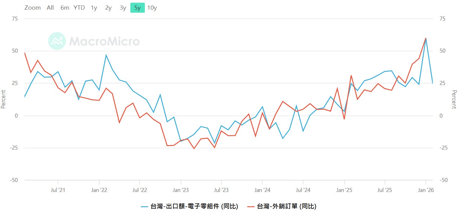 台灣-電子零組件出口(年增率) ,台灣-外銷訂單(年增率)注意高低點極值(-10~+20),資料來源:MacroMicro 財經M平方,SimonShih,財經雷說明