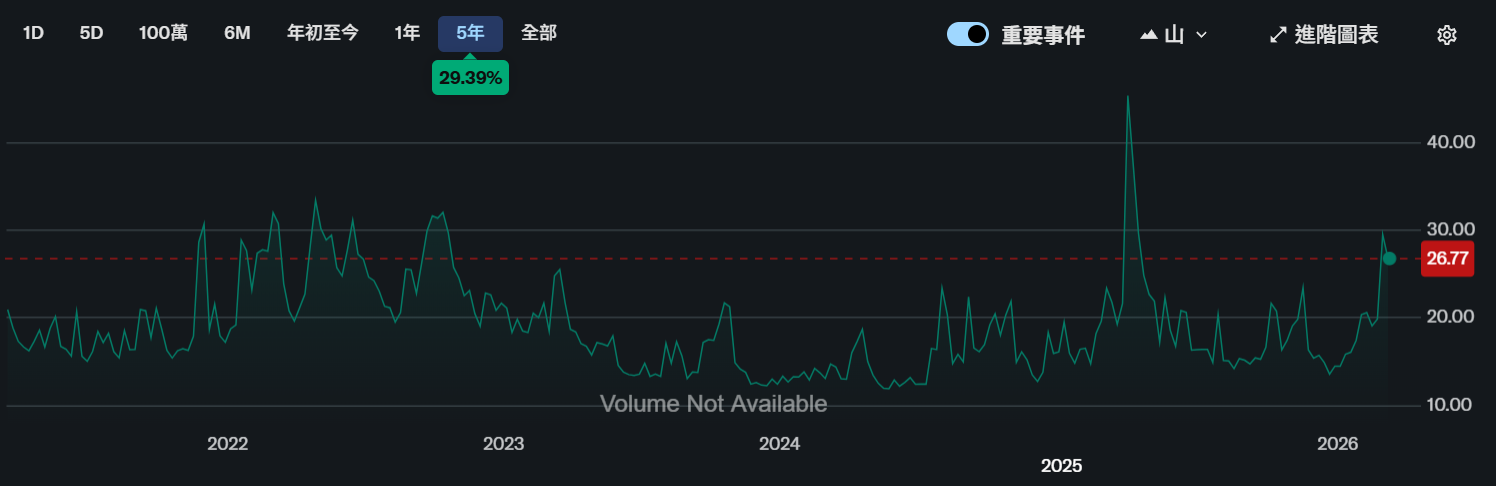 VIX :期權市場對未來 30 天標普 500 波動率預期,VIX長期平均約在19左右。若低於15,代表市場平靜;超過25,開始進入不安;若衝破30或40,多半是危機時刻,但它只能告訴你市場「表面的恐懼」,資料來源 : yahoo finance